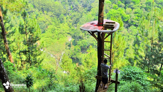 Salah satunya bentuknya lope lopean gitu, terus yang satunya ( maaf enggak sempat terambil gambarnya ) bentuknya biasa, kayak rumah pohon pada umumnya. Nggak tau kenapa akhir-akhir ini di tempat-tempat wisata dikasih rumah pohon rumah pohon gitu ya sob. Heeee.. Nah ketika udah nggak ada yang manjat saya memutuskan buat naik. Dengan pedenya saya menapaki anak-anak tangga yang terbuat dari bambu. Ketika berada diatas pas ngambil gambar tiba-tiba kaki saya ini hampir keram mendadak dan agak-agak merinding.... why? soalnya ini rumah pohon bawahnya langsung jurang.. brrrrrrrr.....